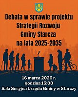 W poniedziałek 16 marca 2026r. o godzinie 15:00 w Sali Sesyjnej Urzędu Gminy w Starczy odbędzie się debata z mieszkańcami oraz pozostałymi interesariuszami w sprawie projektu Strategii Rozwoju Gminy Starcza na lata 2025-2035.Strategia Rozwoju Gminy Starcza na lata 2025-2035 to kluczowy dokument